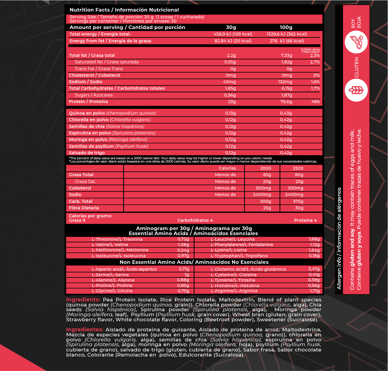 Su fórmula aporta proteína completa, fibra, vitaminas, minerales y antioxidantes, apoyando la recuperación muscular, la digestión y el bienestar general. Es libre de lactosa, aspartamo y colesterol, convirtiéndola en una excelente alternativa para personas veganas, vegetarianas o con intolerancia a la lactosa.